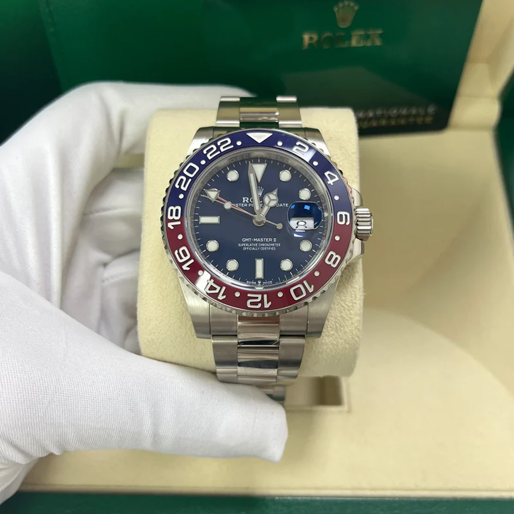 | Model Name: | Rolex GMT Master II White Gold Pepsi Bezel Blue Dial Mens Watch 126719 Box Card |