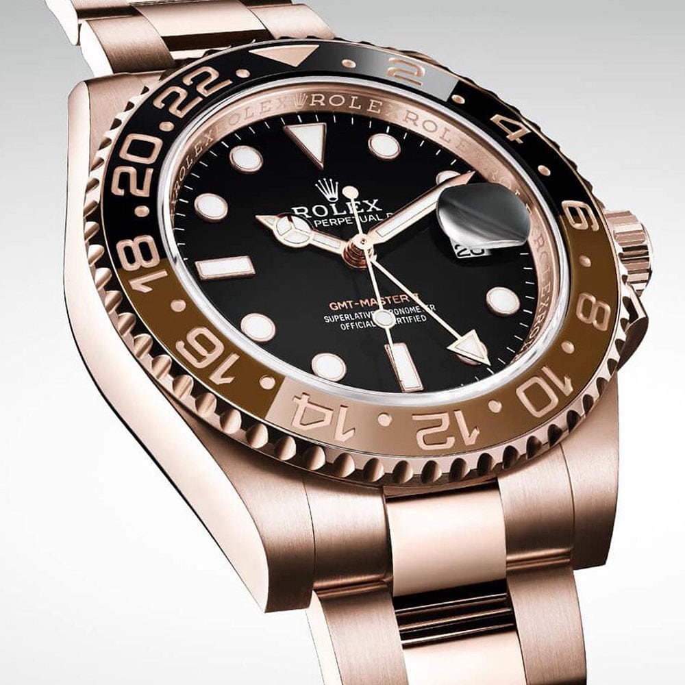 40mm 18K Everose case, screw-down crown, bidirectional rotatable 24-hour graduated bezel with brown and black Cerachrom insert and engraved numerals, scratch-resistant sapphire crystal with cyclops lens over the date, black dial, hour markers set with Chromalight, Rolex calibre 3285 self-winding movement with second time-zone hour hand and instantaneous date, approximately 70 hours of power reserve, Oyster bracelet with flat three-piece links, folding Oysterclasp buckle with Easylink 5mm comfort extension link. Waterproof to 100 meters.