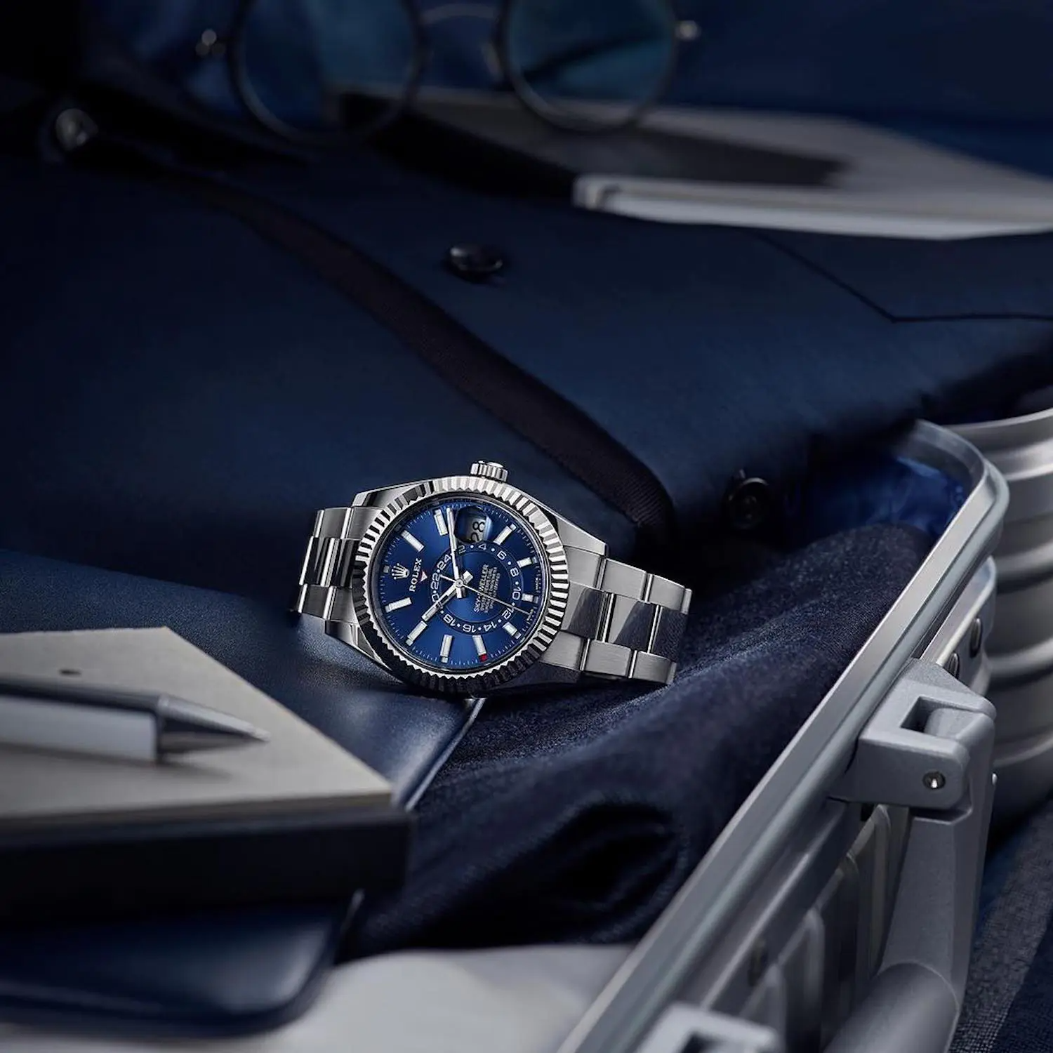 The Oyster Perpetual Sky‑Dweller in Oystersteel and white gold with a bright blue dial and an Oyster bracelet.