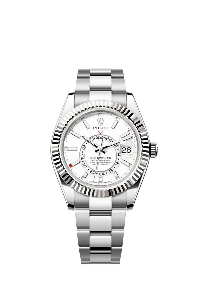 The Sky-Dweller is fitted on a solid-link Oyster bracelet in Oystersteel, in the case of the white Rolesor version, or, for the yellow Rolesor version, an Oyster bracelet combining Oystersteel and yellow gold.