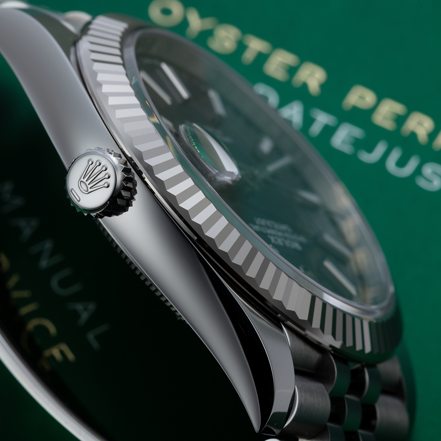 The light reflections on the case sides and lugs highlight the elegant profile of the 41 mm Oyster case, which is fitted with a fluted bezel. Aesthetically, the Datejust has spanned eras, while retaining the enduring codes that make it, notably in its traditional versions, one of the most recognized and recognizable of watches.
